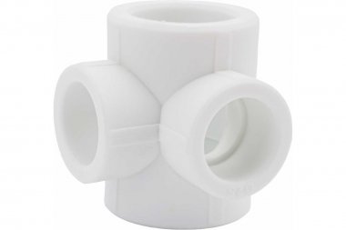 Полипропиленовый фитинг. Позволяет выполнять присоединение трубопроводов в двух взаимоперпендикулярных плоскостях труб разного диаметра. Монтаж производится методом раструбной сварки. Свариваемые поверхности – внутренние.