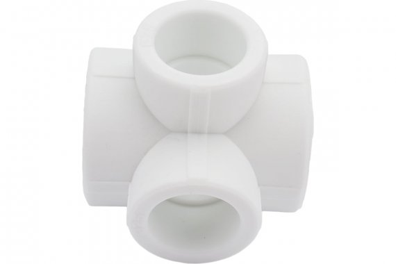 Полипропиленовый фитинг. Позволяет выполнять присоединение трубопроводов в двух взаимоперпендикулярных плоскостях труб разного диаметра. Монтаж производится методом раструбной сварки. Свариваемые поверхности – внутренние.
