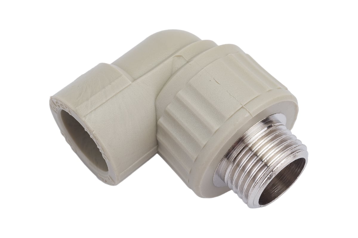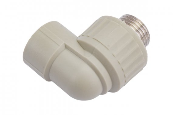 Комбинированный полипропиленовый фитинг. Используется для изменения направления потока и перехода на трубную резьбу. Латунные части производятся методом горячего штампования, пластиковые - методом литья под давлением.
