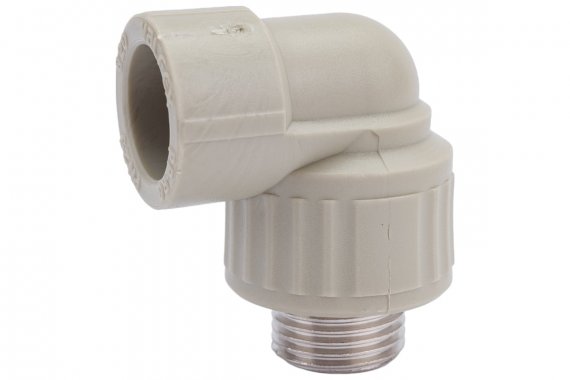 Комбинированный полипропиленовый фитинг. Используется для изменения направления потока и перехода на трубную резьбу. Латунные части производятся методом горячего штампования, пластиковые - методом литья под давлением.
