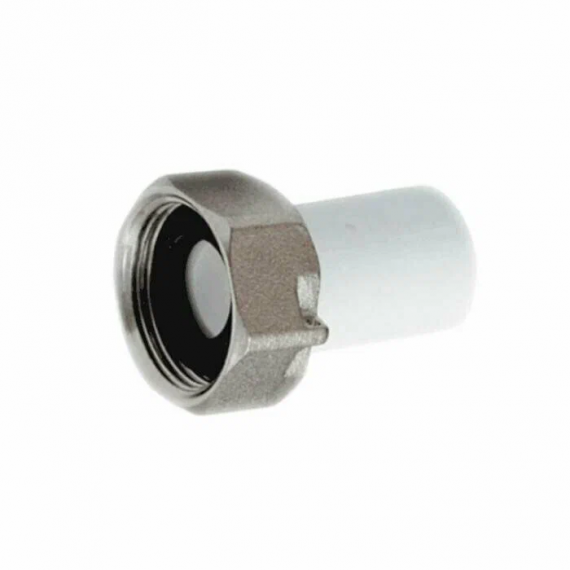 Штуцер полипропиленовый с накидной гайкой. Позволяет подсоединить к трубопроводу из полипропилена элемент системы с резьбовым подключением. Накидная гайка выполнена из латуни с никелевым покрытием. Резьба – внутренняя.