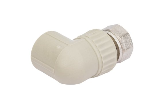 Угольник с накидной гайкой — двухсторонний полипропиленовый фитинг для соединения под углом 90° друг к другу полипропиленового трубопровода и компонента инженерной системы с резьбовым подключением. Монтаж осуществляется с помощью накидной гайки.