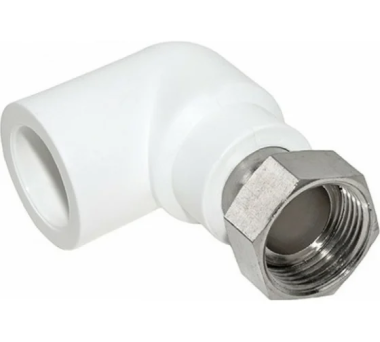 Угольник с накидной гайкой — двухсторонний полипропиленовый фитинг для соединения под углом 90° друг к другу полипропиленового трубопровода и компонента инженерной системы с резьбовым подключением. Монтаж осуществляется с помощью накидной гайки.