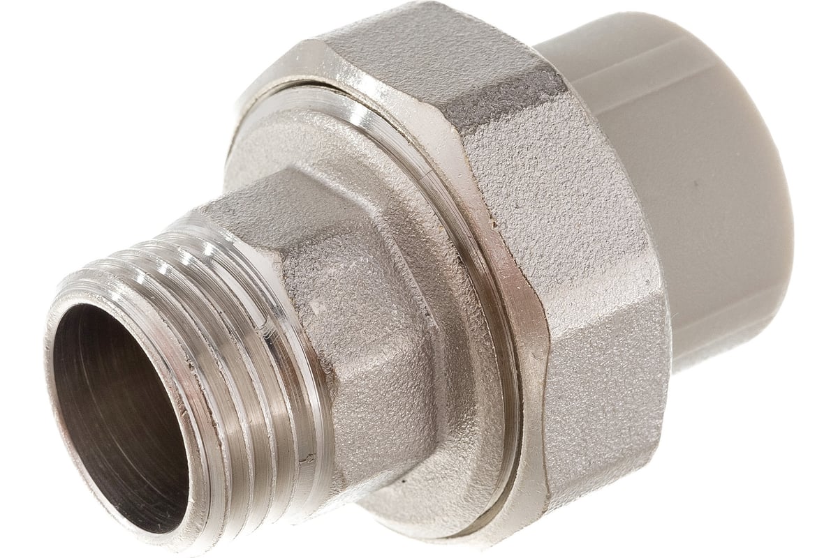 Муфта комбинированная разъёмная (американка) с наружной резьбой — комбинированный полипропиленовый фитинг. Представляет собой разъемное соединение между металлической и пластиковой трубой. Латунные части производятся методом горячего штампования, пластиковые - методом литья под давлением.