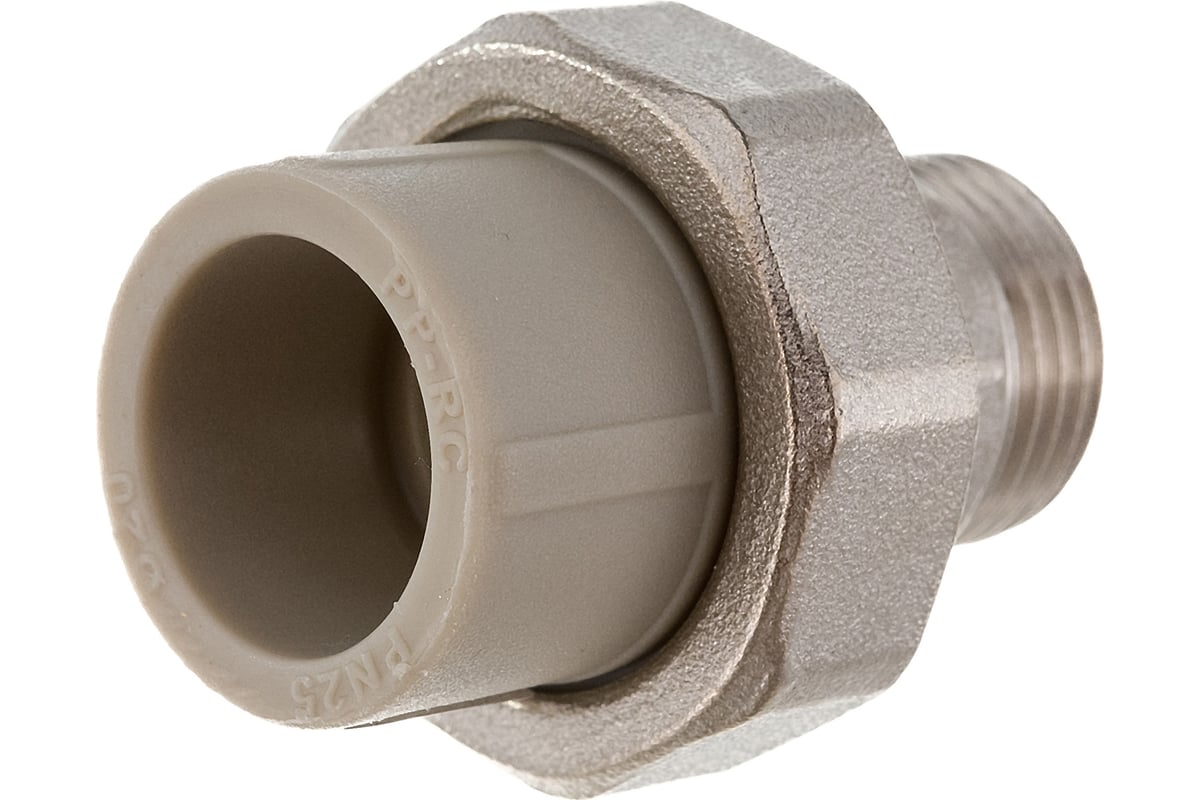 Муфта комбинированная разъёмная (американка) с наружной резьбой — комбинированный полипропиленовый фитинг. Представляет собой разъемное соединение между металлической и пластиковой трубой. Латунные части производятся методом горячего штампования, пластиковые - методом литья под давлением.
