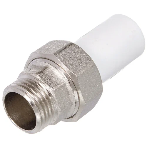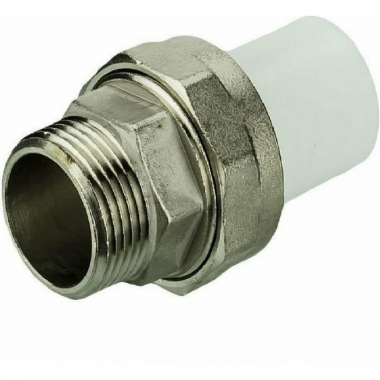 Комбинированный полипропиленовый фитинг. Представляет собой разъемное соединение с окончанием в виде трубы. Соединение осуществляется через полипропиленовый фитинг. Латунные части производятся методом горячего штампования, пластиковые - методом литья под давлением.