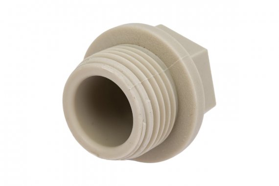 Полипропиленовый фитинг. Подходит как временная заглушка при опрессовке трубопровода, соединяется с трубной резьбой соответствующего диаметра. Производится методом литья под давлением.