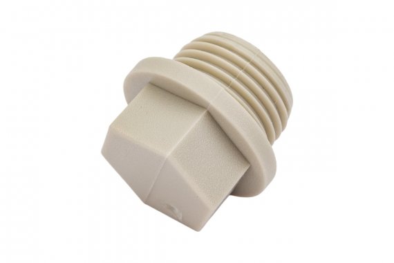 Полипропиленовый фитинг. Подходит как временная заглушка при опрессовке трубопровода, соединяется с трубной резьбой соответствующего диаметра. Производится методом литья под давлением.