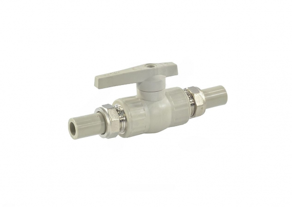 Кран шаровой полнопроходной с односторонним разъемным соединением – вид запорной арматуры, применяющийся для перекрытия потока жидкости в трубах. Разъёмное соединение этого шарового крана позволяет отсоединить от него полипропиленовую трубу с одной стороны. Такое применение может быть удобным в случае если к крану необходимо периодически присоединять другие трубы. Второй конец фитинга монтируется при помощи сварки в монолитное соединение.