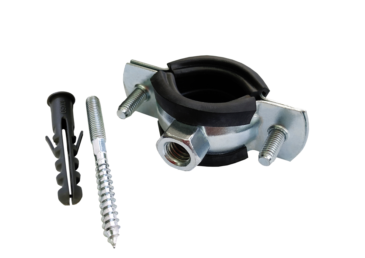 Хомут выполнен из оцинкованной стали с резиновым уплотнителем. В комплект входит шпилька М8*80 и дюбель. Применяется для фиксации на горизонтальных и вертикальных поверхностях (пол, стены, потолок) труб холодного, горячего водоснабжения, отопления, водоотведения, газопроводов и других инженерных систем.