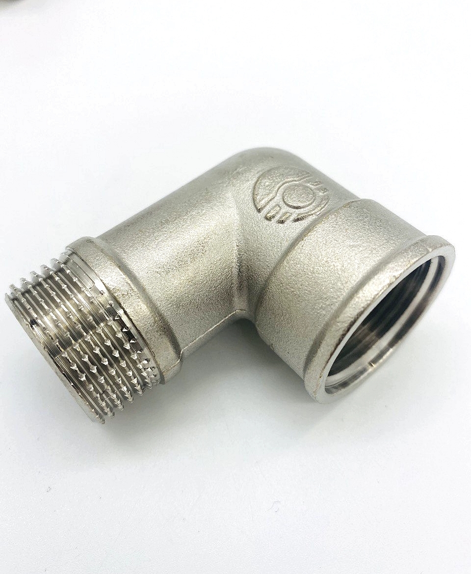 Угольник с переходом на наружную резьбу - угловой латунный никелированный фитинг, который позволяет соединить две трубы под прямым углом. Резьба – внутренняя/наружная, цилиндрическая трубная по ГОСТу 6357-81. Фитинги рассчитаны на рабочее давление (PN) 2,5 и 4,0 МПа и температуру транспортируемых сред от -20 до +150 °С.