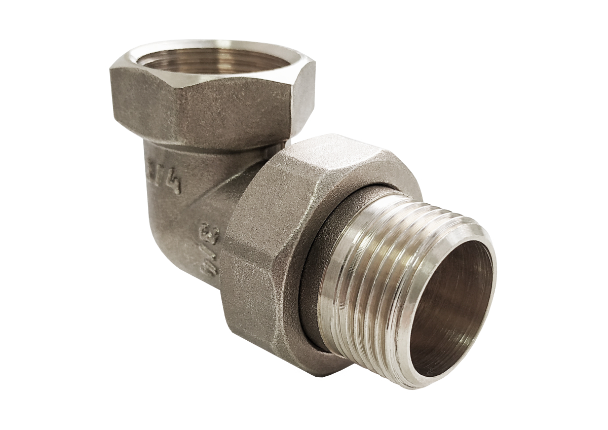 Угловой разъемный сгон с никелевым покрытием, смонтированный из двух частей с помощью накидной гайки (соединение типа «американка»).