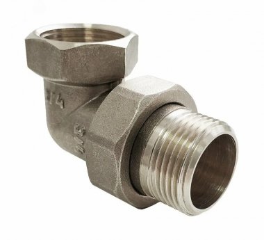 Угловой разъемный сгон с никелевым покрытием, смонтированный из двух частей с помощью накидной гайки (соединение типа «американка»).Резьба – внутренняя/наружная, цилиндрическая трубная по ГОСТу 6357-81. Детали изготовлены методом горячей объемной штамповки из высококачественной латуни марки ЛС 59-1. Уплотнительное кольцо – из синтетического каучука EPDM. Фитинги рассчитаны на рабочее давление (PN) 2,5 и 4,0 МПа и температуру транспортируемых сред от -20 до +150 °С.