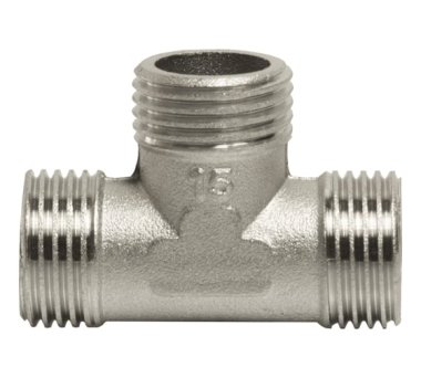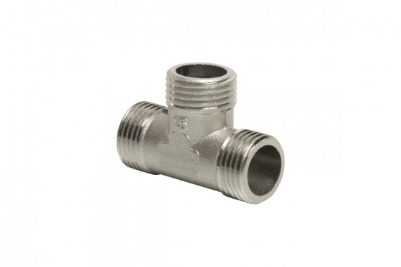 Латунный никелированный трехсторонний фитинг, равнопроходной/переходной, соединяющий три отрезка трубы, один из которых устанавливается перпендикулярно двум другим. Резьба - наружная/наружная/наружная цилиндрическая трубная по ГОСТу 6357-81. Фитинги рассчитаны на рабочее давление (PN) 2,5 и 4,0 Мпа и температуру транспортируемых сред от -20 до +150 °С.