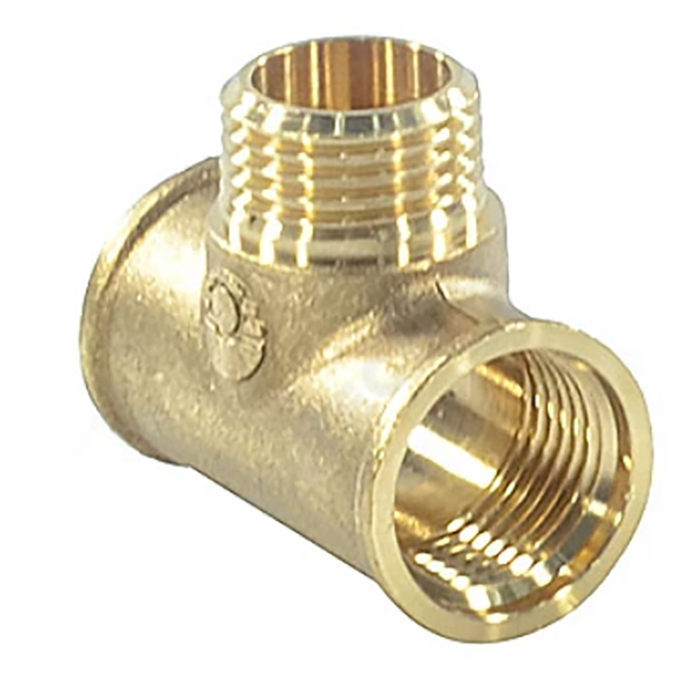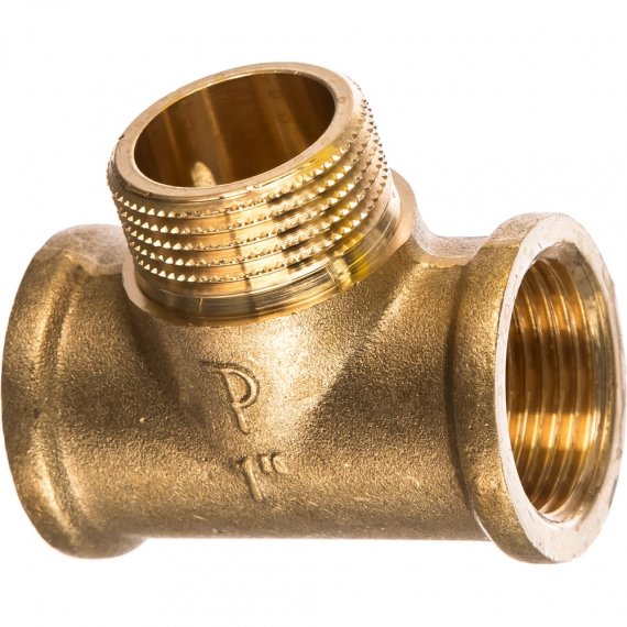 Латунный трехсторонний фитинг, равнопроходной, соединяющий три отрезка трубы, один из которых устанавливается перпендикулярно двум другим. Резьба - внутренняя/наружная/внутренняя цилиндрическая трубная по ГОСТу 6357-81. Фитинги рассчитаны на рабочее давление (PN) 2,5 и 4,0 МПа и температуру транспортируемых сред от -20 до +150 °С.