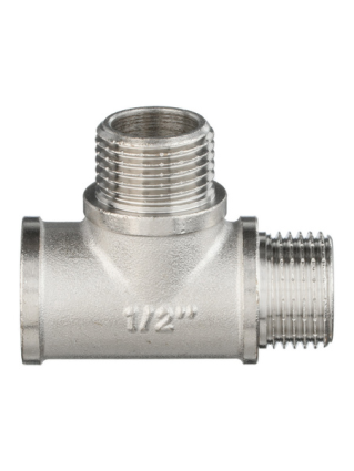 Латунный трехсторонний фитинг, равнопроходной, соединяющий три отрезка трубы, один из которых устанавливается перпендикулярно двум другим. Резьба - внутренняя/наружная/наружная цилиндрическая трубная по ГОСТу 6357-81. Фитинги рассчитаны на рабочее давление (PN) 2,5 и 4,0 МПа и температуру транспортируемых сред от -20 до +150 °С.
