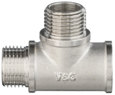 Латунный трехсторонний фитинг, равнопроходной, соединяющий три отрезка трубы, один из которых устанавливается перпендикулярно двум другим. Резьба - внутренняя/наружная/наружная цилиндрическая трубная по ГОСТу 6357-81. Фитинги рассчитаны на рабочее давление (PN) 2,5 и 4,0 МПа и температуру транспортируемых сред от -20 до +150 °С.