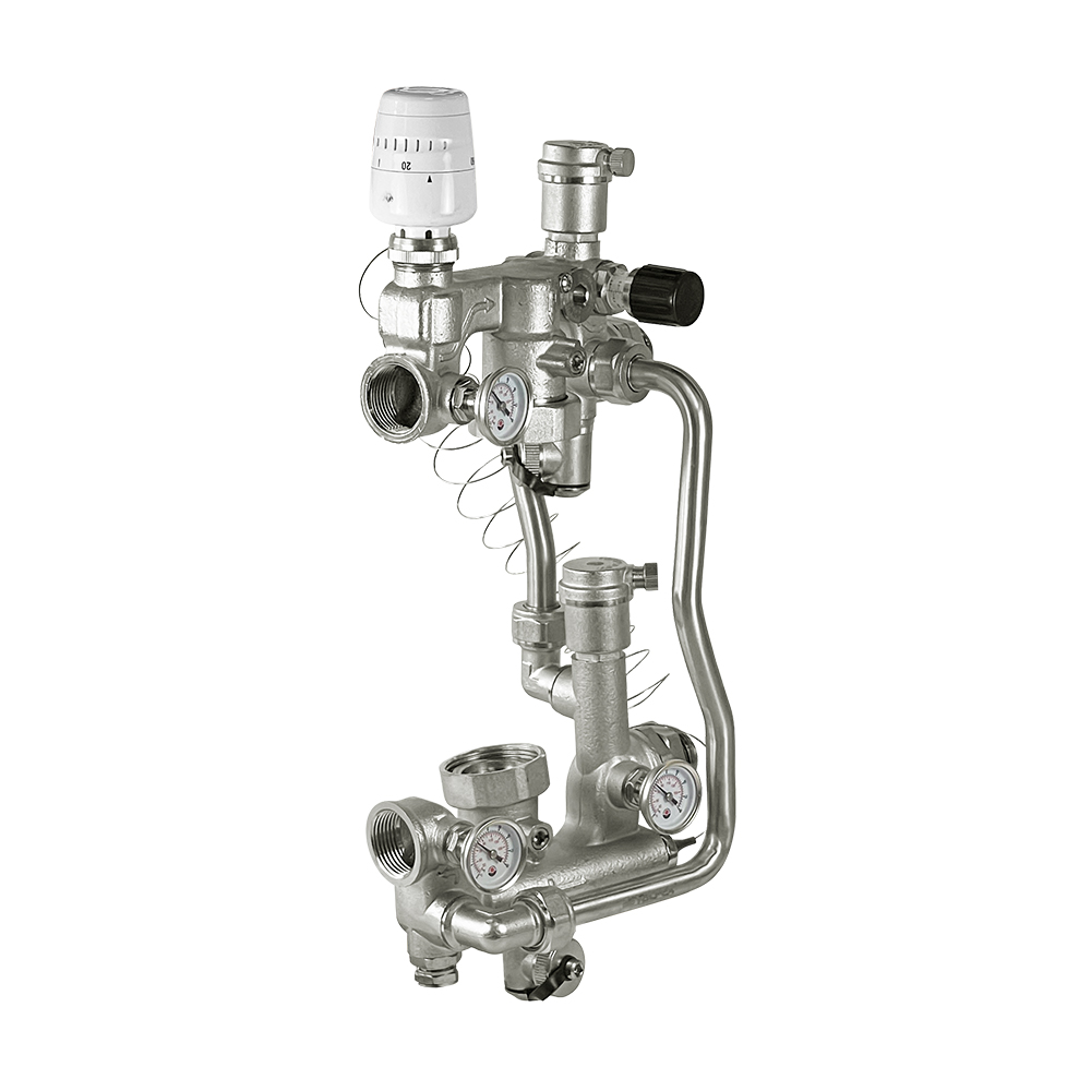 Насосно-смесительный узел с термоголовкой предназначен для создания в системе отопления вторичного циркуляционного контура с автоматической регулировкой температуры теплоносителя согласно заданного значения.