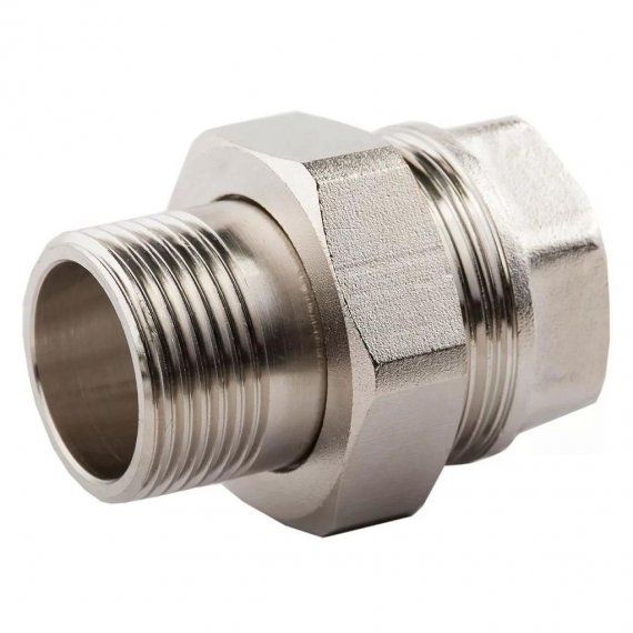 Разъемный сгон, смонтированный из двух частей с помощью накидной гайки (соединение типа «американка»). Резьба – внутренняя/наружная, цилиндрическая трубная по ГОСТу 6357-81. Детали изготовлены методом горячей объемной штамповки из высококачественной латуни марки ЛС 59-1. Уплотнительное кольцо – из синтетического каучука EPDM. Фитинги рассчитаны на рабочее давление (PN) 2,5 и 4,0 МПа и температуру транспортируемых сред от -20 до +150 °С.