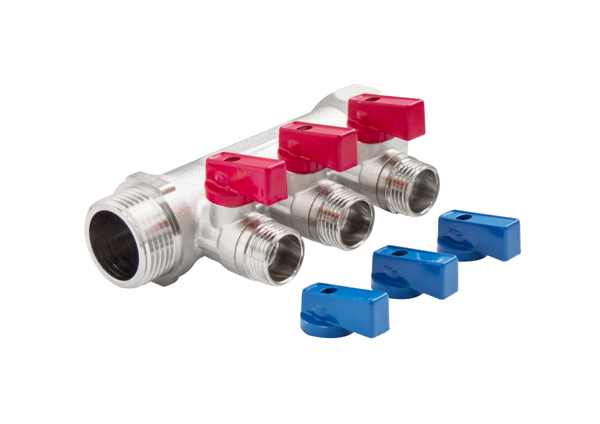 Коллектор с отсекающими кранами распределяют поток транспортируемой среды по контурам систем водяного отопления, таких как: контур или петля теплого пола, отдельные части или ветви системы, группа или отдельный нагревательный прибор. Предназначены как для водяного, так и для низкозамерзающего гликолевого теплоносителя.