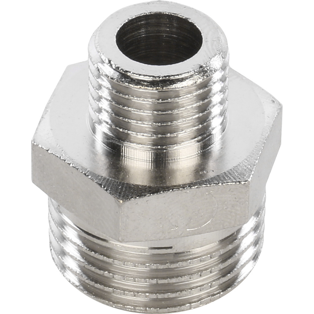 Ниппель переходной с никелевым покрытием (наруж.-наруж.) — фитинг, представляющий собой изделие с наружной резьбой на обоих концах, с помощью которых он соединяется с другими участками трубопровода разного диаметра, резьба цилиндрическая трубная по ГОСТу 6357-81. Предусмотрен участок корпуса шестигранной формы, под гаечный ключ, что облегчает монтаж соединения.