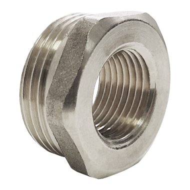 Футорка – это фитинг, обеспечивающий соединение труб разного типоразмера, подключение трубопровода к элементу системы с большим диаметром присоединительного патрубка, ремонт (замену) поврежденной резьбы. Футорка изготовлена методом горячей объемной штамповки из высококачественной латуни марки ЛС 59-1 с гальваническим нанесением никелевого покрытия. Резьба – наружная/внутренняя, по типу – трубная цилиндрическая по ГОСТу 6357-81. Шестигранная головка футорки служит ее вкручиванию гаечным ключом. Фитинги рассчитаны на рабочее давление (PN) 2,5 и 4,0 МПа и температуру транспортируемых сред от -20 до +150 °С.