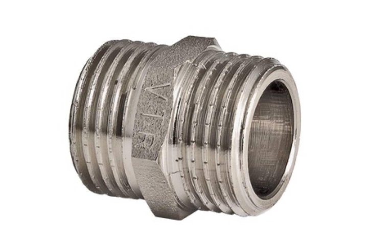 Ниппель с никелевым покрытием (наруж.-наруж.) — латунный фитинг, представляющий собой изделие с наружной резьбой на обоих концах, с помощью которых он соединяется с другими участками трубопровода равного диаметра, резьба цилиндрическая трубная по ГОСТу 6357-81. Предусмотрен участок корпуса шестигранной формы, под гаечный ключ. Фитинги рассчитаны на рабочее давление (PN) 2,5 и 4,0 МПа и температуру транспортируемых сред от -20 до +150 °С.