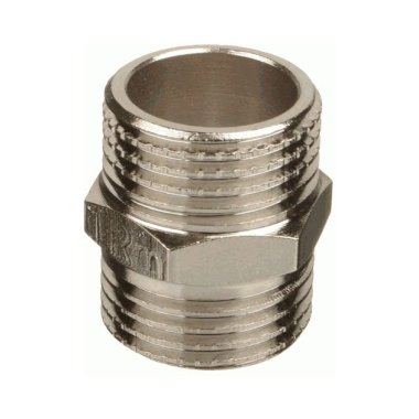 Ниппель с никелевым покрытием (наруж.-наруж.) — латунный фитинг, представляющий собой изделие с наружной резьбой на обоих концах, с помощью которых он соединяется с другими участками трубопровода равного диаметра, резьба цилиндрическая трубная по ГОСТу 6357-81. Предусмотрен участок корпуса шестигранной формы, под гаечный ключ. Фитинги рассчитаны на рабочее давление (PN) 2,5 и 4,0 МПа и температуру транспортируемых сред от -20 до +150 °С.