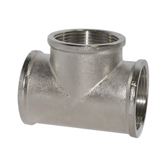 Тройник переходной с никелевым покрытием (внутр.) - латунный трехсторонний фитинг с переходом на меньший диаметр в центральном выходе. Резьба – внутренняя, цилиндрическая трубная по ГОСТу 6357-81. Фитинги рассчитаны на рабочее давление (PN) 2,5 и 4,0 Мпа и температуру транспортируемых сред от -20 до +150 °С.